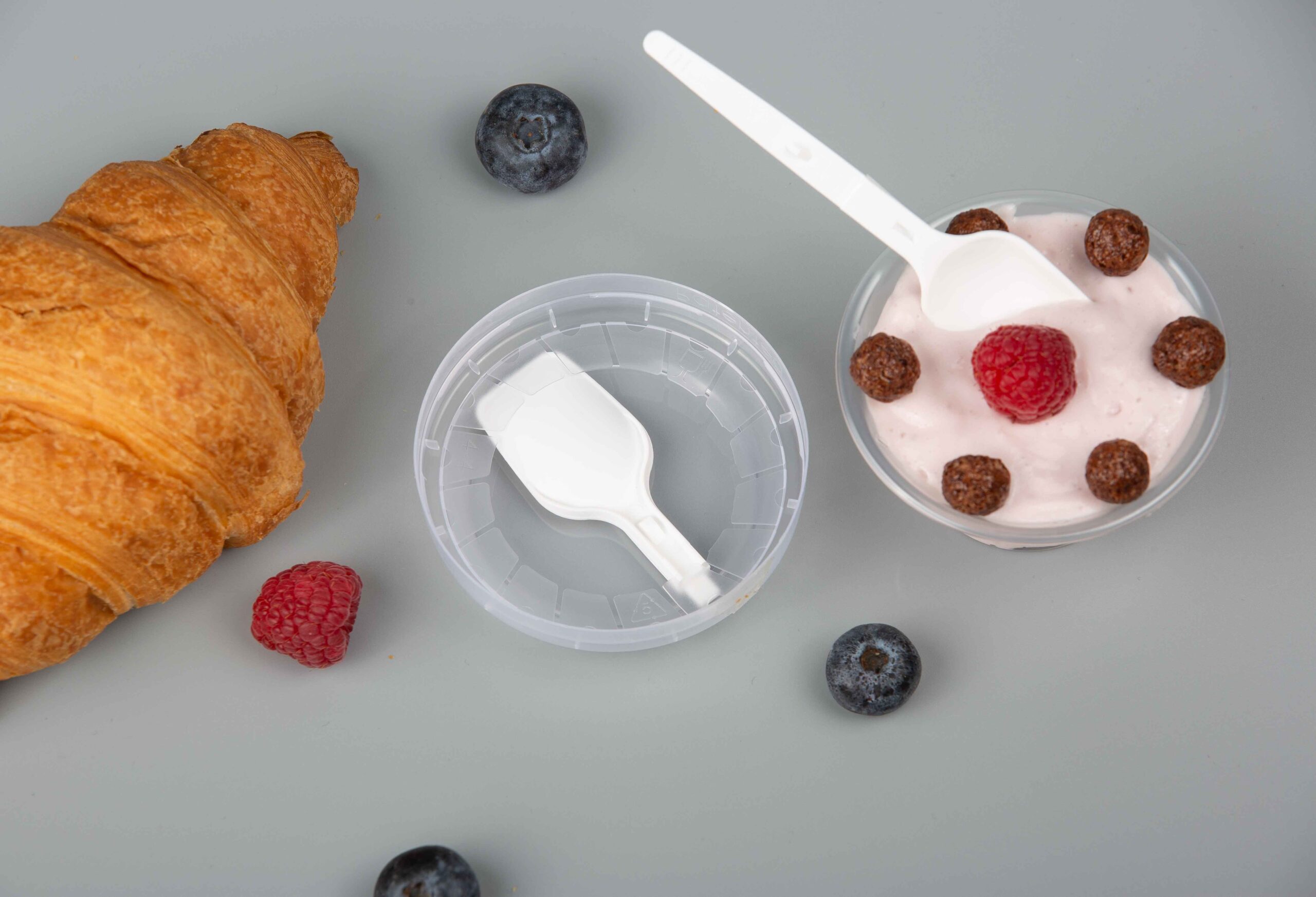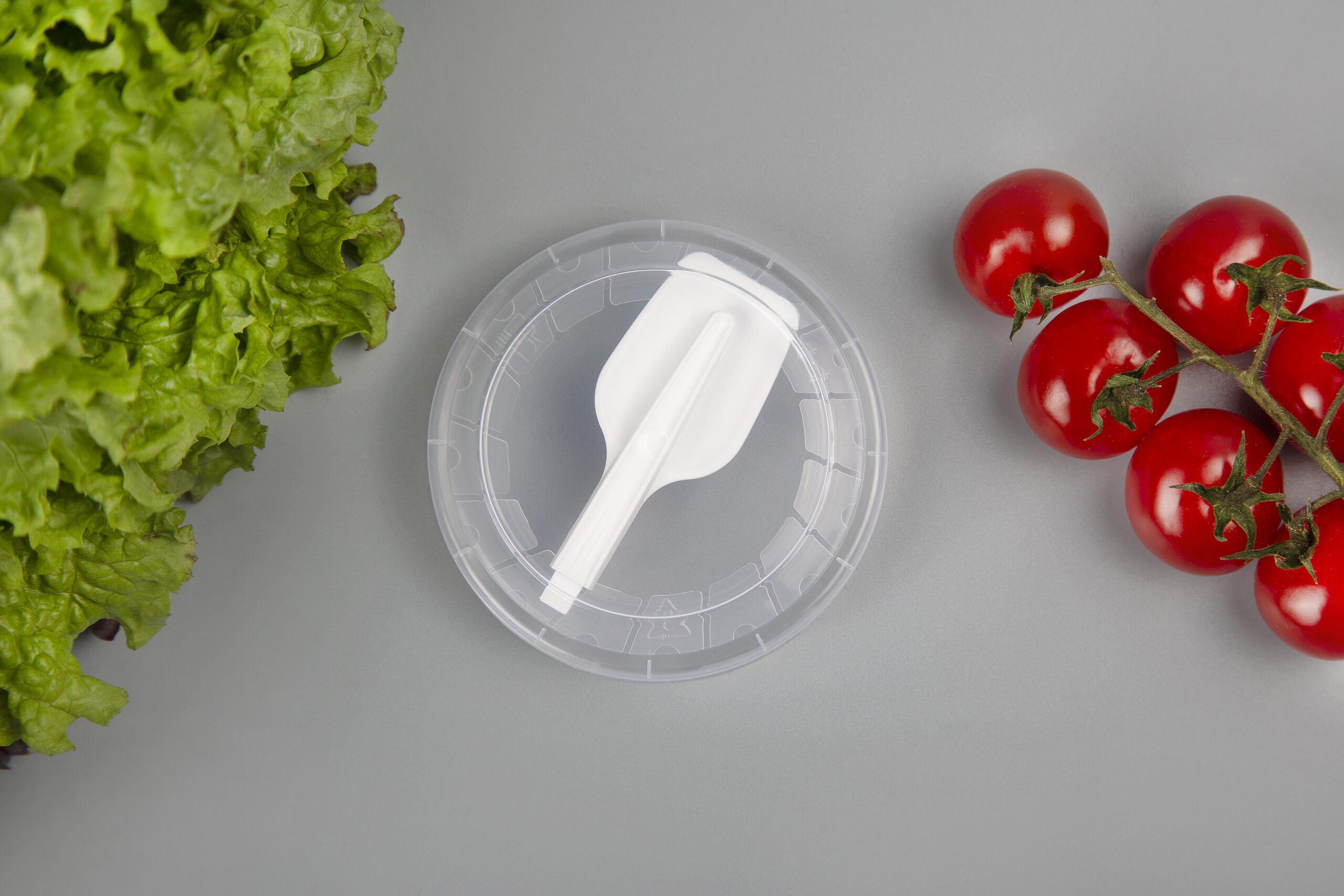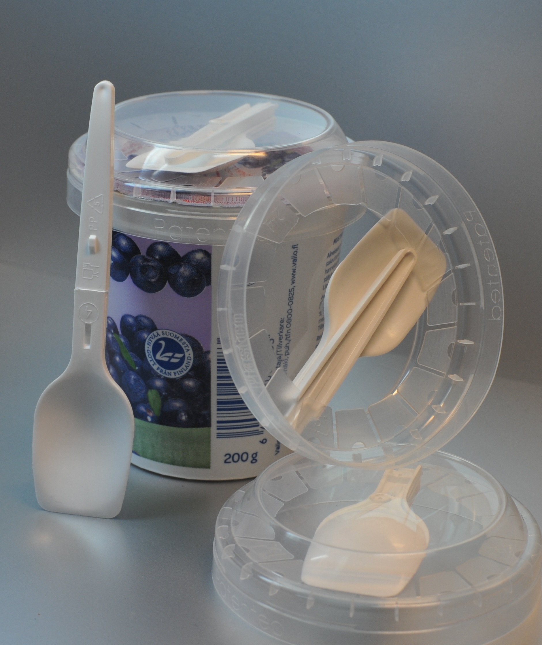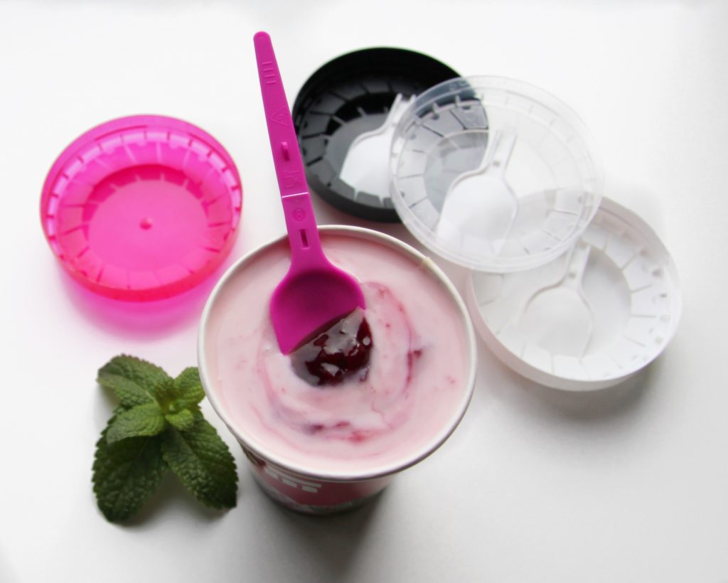 Składana łyżka, umieszczona wewnątrz pokrywki, pozwala spożywać lody, jogurty, galaretki, sałatki owocowi, płatki zbożowi, platki owsiani i inni produkty w drodze.